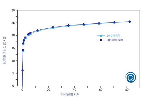 从上面的吸附曲线可以看出,SKR压缩空气干燥器即使在相对湿度非常低的情况下依然对水吸附性很强,在10%的相对湿度下吸附自重的20%的水量。SKR压缩空气干燥器在吸附自重25%情况下达到平衡状态,通过曲线可以看出非常容易解吸附恢复性能。